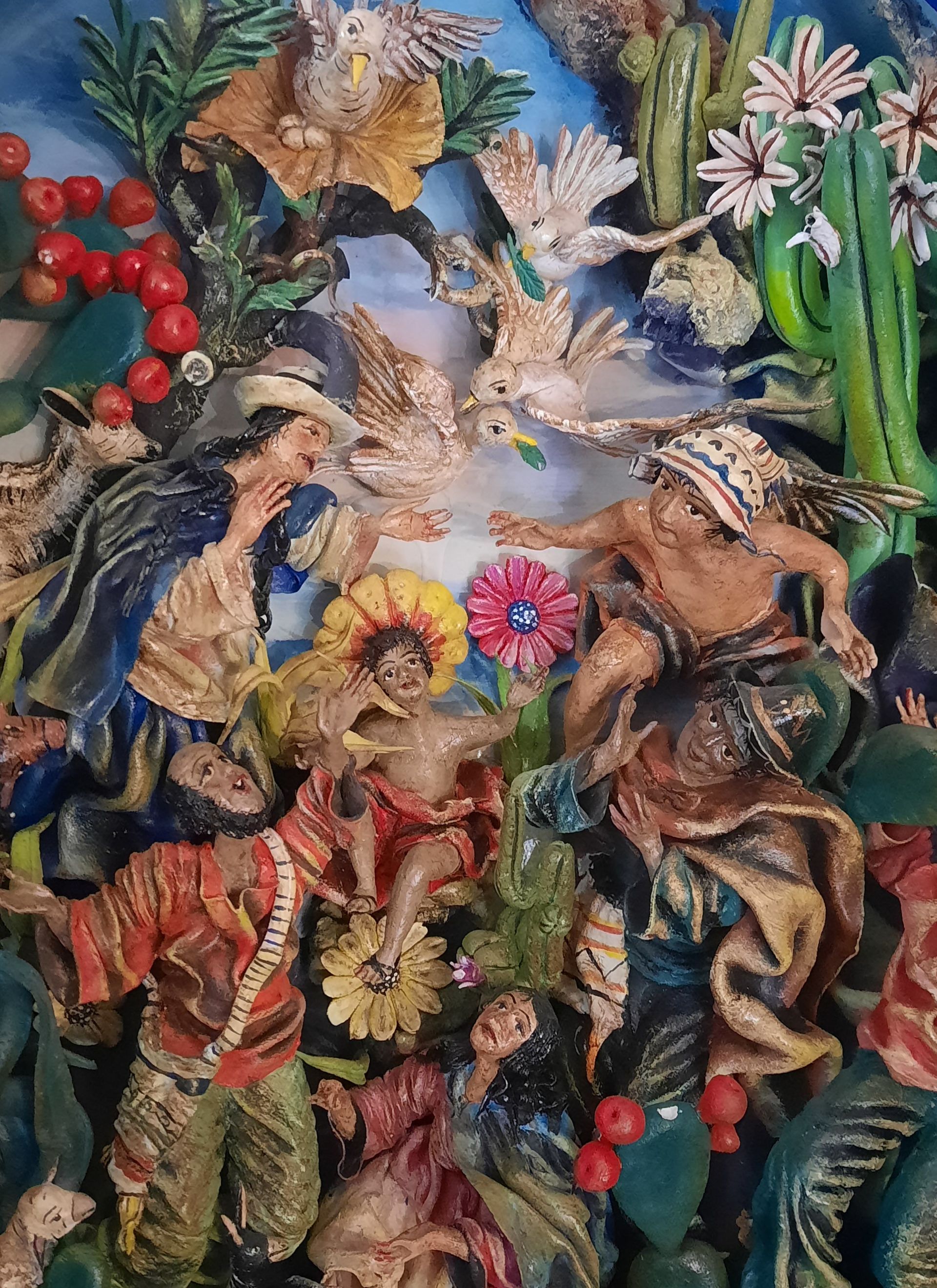 «Vielleicht darf man behaupten, dass der lateinamerikanische Katholizismus ohne Krippen überhaupt nicht denkbar, nicht verständlich und heute auch nicht als so lebendig und liebenswürdig bekannt wäre. Aus der Vermischung des europäischen Kulturgutes der Missionare mit dem überwältigenden Kunstsinn und Formenreichtum des indigenen Erbes vorchristlicher Zeit ging eine religiöse Volkskunst hervor, die als originär bezeichnet werden muss. Ton, Pappmaché und Kaschieren, Brennen und Bemalen sind die wenigen Mittel, mit denen einzelne Figuren und ganze Krippendarstellungen, Kompositionen, Geräte in vielfältigen Ausführungen entstanden. Die Mehrzahl lateinamerikanischer Arbeiten stammt überwiegend nicht von einzelnen Künstlern, wie dem grossartigen Hilario Mendivil in Cuzco, sondern aus Kollektiven von ganzen Familien oder sogar ganzen Dörfern mit den je eigenen Formen und Farben.»